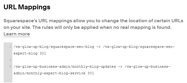 Squarespace redirects are relatively straightforward, all within the dedicated URL Mappings panel.